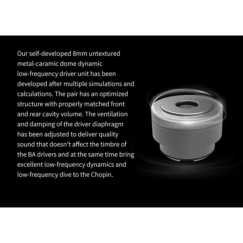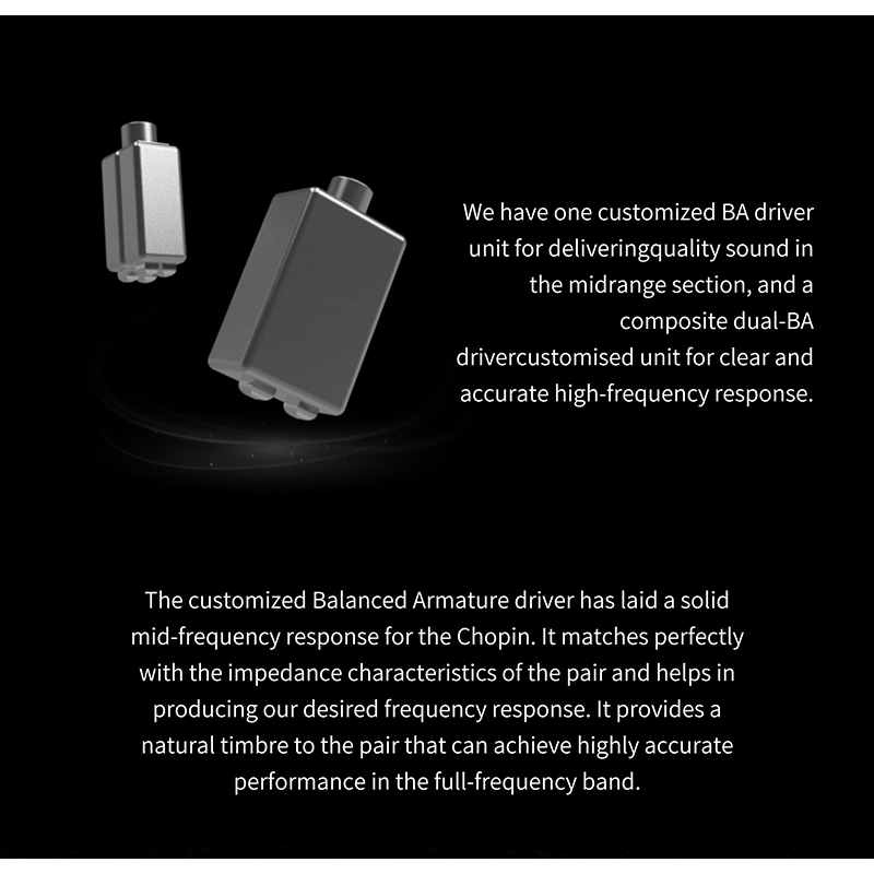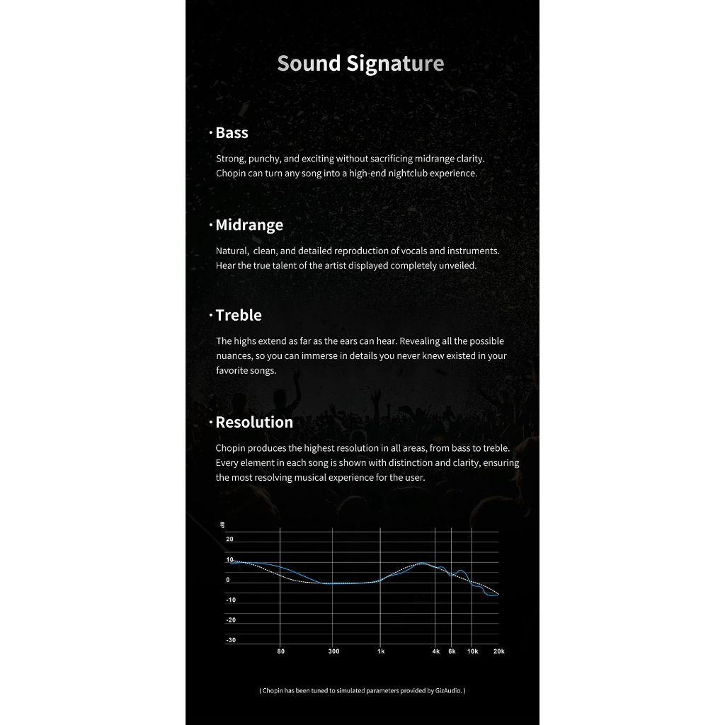 Featuring a dynamic and three balanced armature drivers, the Chopin offers a U-shaped sound signature, ensuring strong, punchy bass, natural midrange, and high-extending treble for a versatile audio experience.
