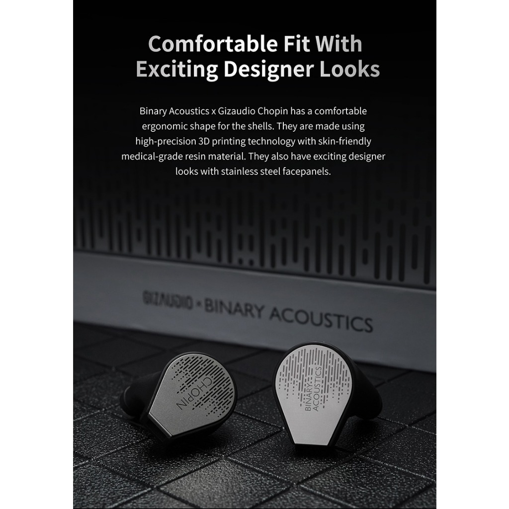 Introducing the Binary x Gizaudio Chopin, where music meets perfection! Crafted in collaboration with Gizaudio, these earphones pay tribute to the legendary Frederic Chopin. Immerse yourself in a world of soulful sound with a four-driver hybrid setup, offering a U-shaped signature adaptable to all genres. Elevate your auditory experience with comfort and elegance.