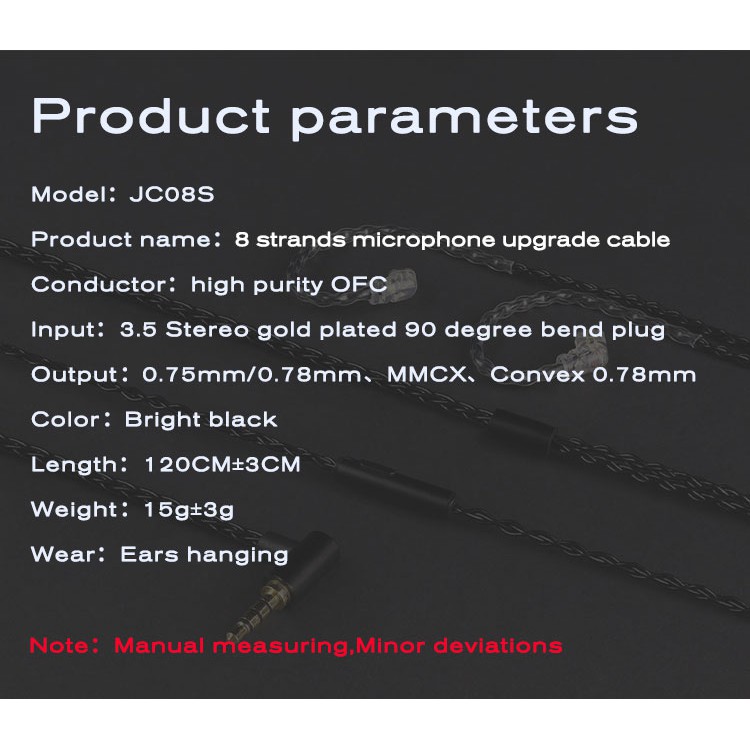 Looking to upgrade your favorite IEM's cables, but still need a mic for calls? The all-new JCALLY JC08S with mic is the answer for your problem. Same with other JCALLY products, it provides the best bang for buck in terms of aesthetics and performance, now with the addition of an HD microphone for video conferences and a multifunction to easily manage your music and calls without taking out your phone.Not sure what cable type to get? Here's our guide:Straight 0.78 2-Pin:- KZ A/B-Pin (AS06, AS10, BA10, ED12, ES3, ES4, ZSA, ZS10, ZSR, ZST, ZS3, ZS4, ZS5, ZS6)- Kinera- BLON- TFZAngled 0.78 2-Pin:- KZ C-Pin (AS12, AS16, ZS10 Pro, ZSN, ZSN Pro, ZSX)- TRN (ST1, VX, BA5)- QDCMMCX:- TIN HIFI- Westone- Shure