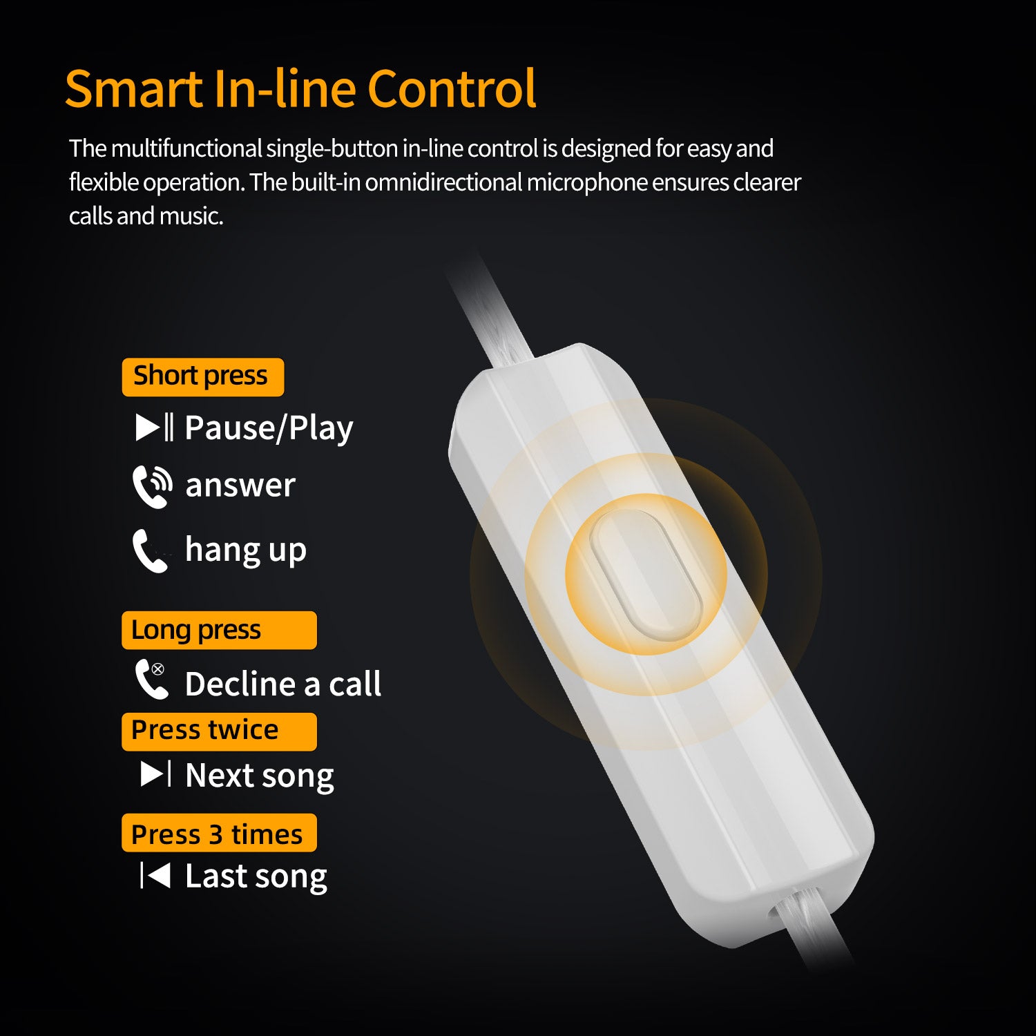 • EASY BUTTON CONTROL – The in-line button makes it simple to play music or take calls. The built-in mic helps your voice sound clear.