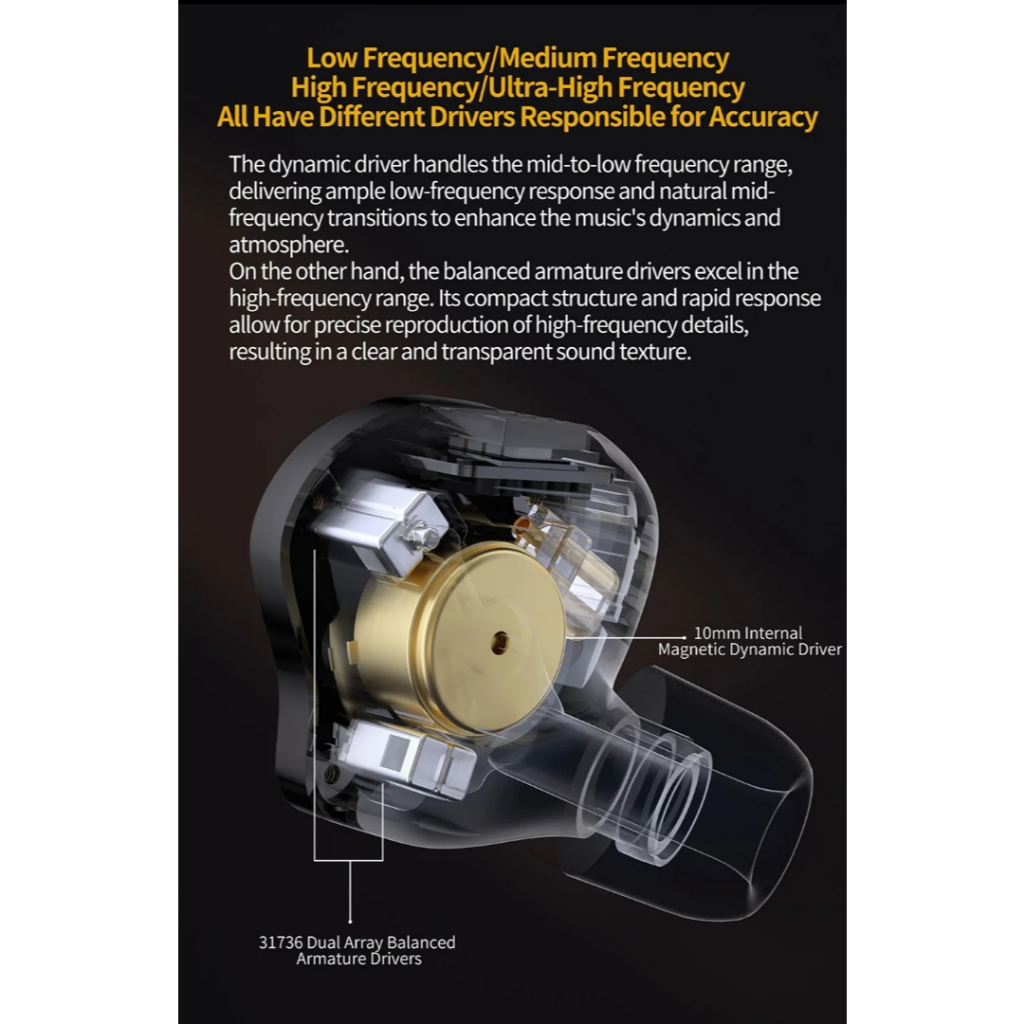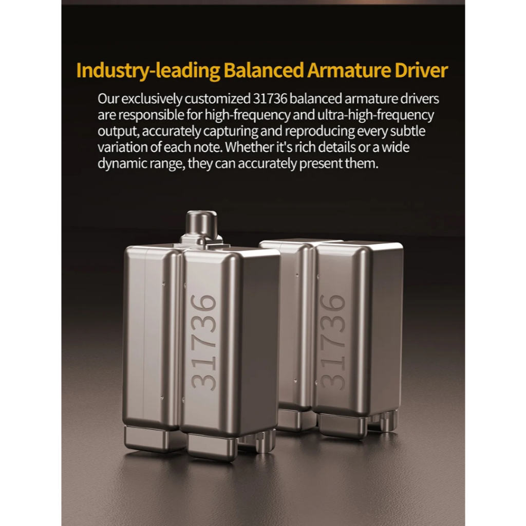 Featuring dual array 31736 Balanced Armature drivers and a 10mm Super-Linear Dynamic Driver, these earphones deliver a balanced and detailed sound with powerful bass, vibrant vocals, and airy treble.