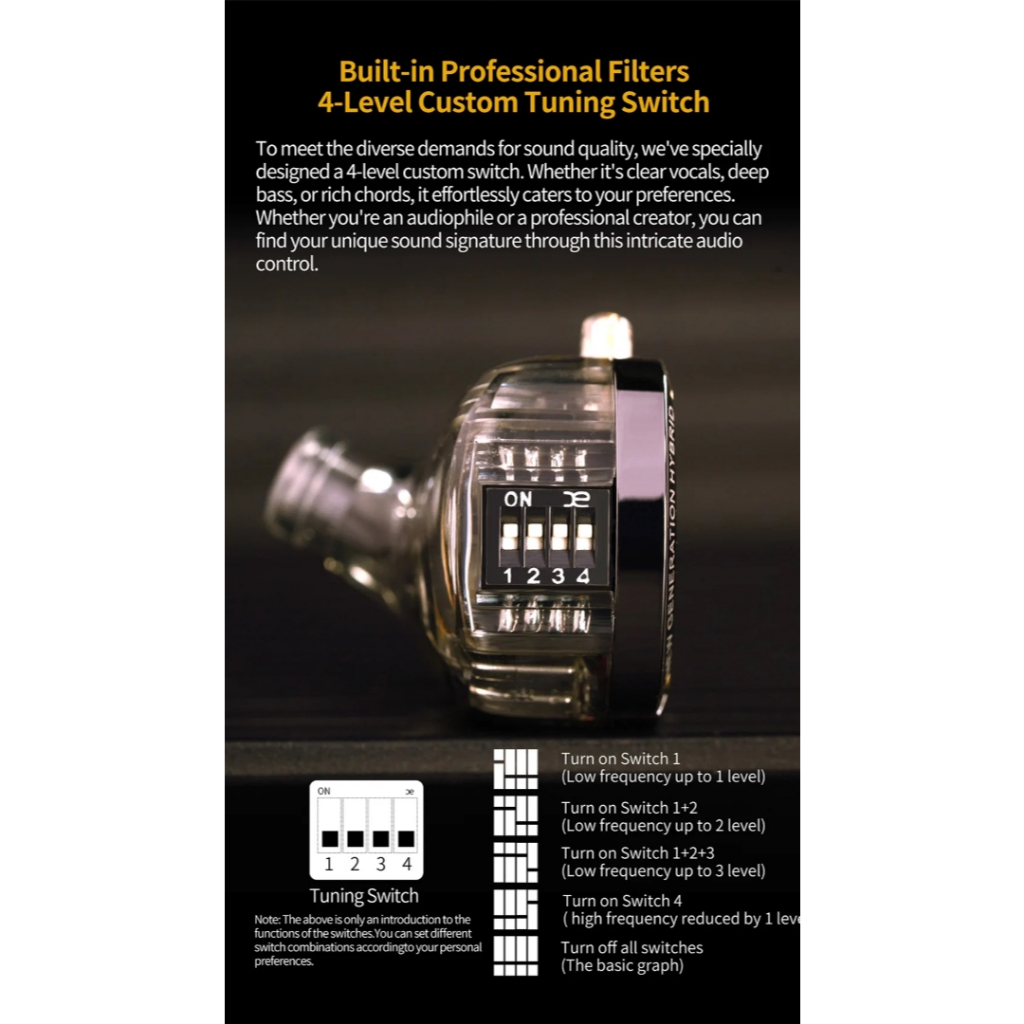 A newly designed 4-level custom tuning switch allows users to adjust low and high frequencies, enabling a personalized sound experience tailored to individual preferences. No software equalizer needed.