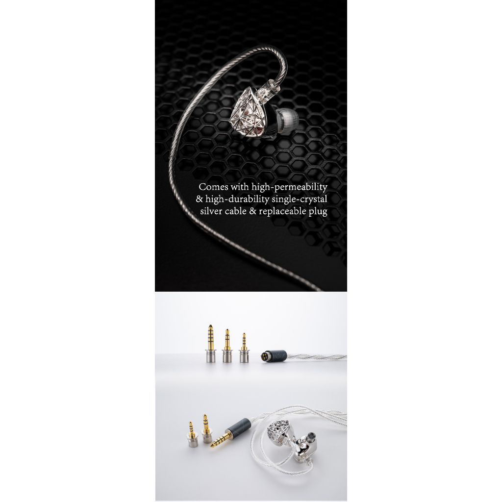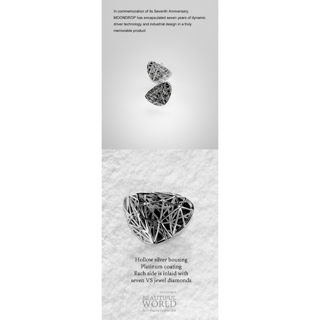 Experience sonic excellence with the Moondrop Beautiful World In-Ear Monitor Earphones. Celebrating 7 years of innovation, this 7th Anniversary Edition is a masterpiece of audio engineering. Limited to only 777 pieces worldwide, each pair is a collector's gem. Crafted with meticulous precision, the hollow silver housing features a platinum coating for elegance and durability. The seven VS jewel diamonds inlaid on each side reflect its exclusivity. Enjoy unparalleled audio with ultra-low distortion pro 10mm dynamic drivers delivering controlled bass, exceptional details, and clarity. The high-permeability, single-crystal silver detachable cable ensures top-notch sound transmission. With replaceable plugs (2.5mm, 3.5mm, 4.4mm), premium spring tips, and a galuchat leather storage case, you're not just owning earphones, but a piece of sonic artistry.
