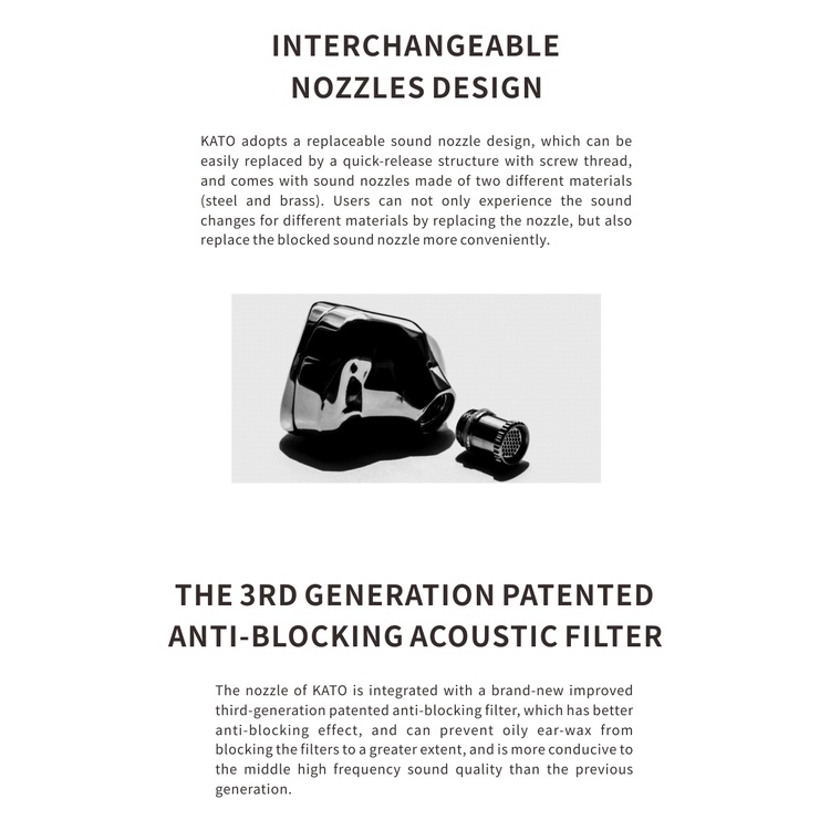 3RD GEN ACOUSTIC FILTERS - Using a patented anti-blocking filter integrated onto the nozzles, the KATO is able to prevent ear wax from building up and interfering with the sound. This allows for a more consistent and reliable sound quality, especially on the mid and high frequencies.