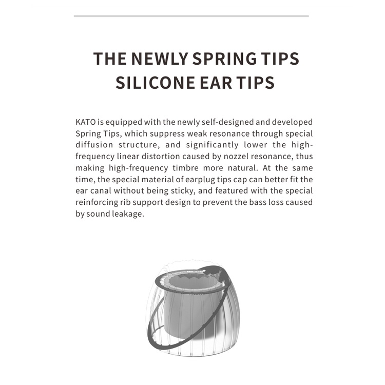SPRING SILICONE EARTIPS - To maximize comfort and noise isolation, the KATO comes with the all-new Spring Tips. These eartips are uniquely designed to suppress distortion and deliver a natural sound. They also offer a snug fit, preventing bass loss and sound leakage.