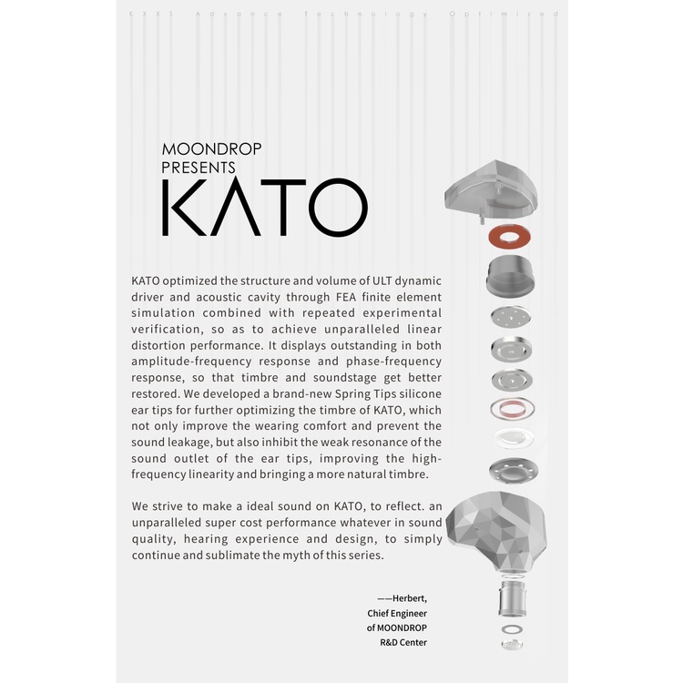 A WORTHY FLAGSHIP SUCCESSOR - With over two years of research and development, Moondrop is now coming with the all-new Ultra Linear Technology Super Linear Dynamic Driver for the KATO. From the diamond-like carbon diaphragm, brass cavity, composite magnetic circuit, everything in this earphone is engineered to give you exceptional sound quality.