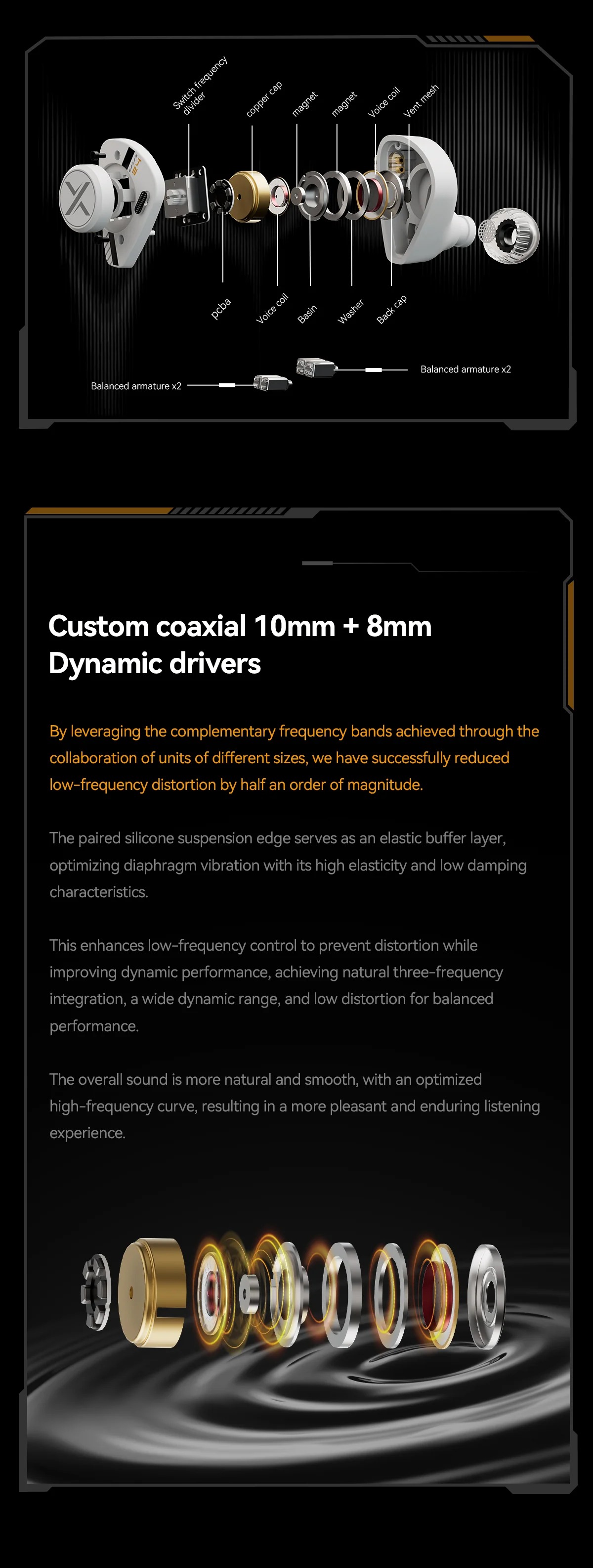 • CUSTOM COAXIAL DRIVER SYSTEM – The 10mm and 8mm dynamic drivers work together to reduce distortion and improve low-end clarity. Their silicone suspension keeps sound stable and natural. Music feels deeper, cleaner, and more alive.