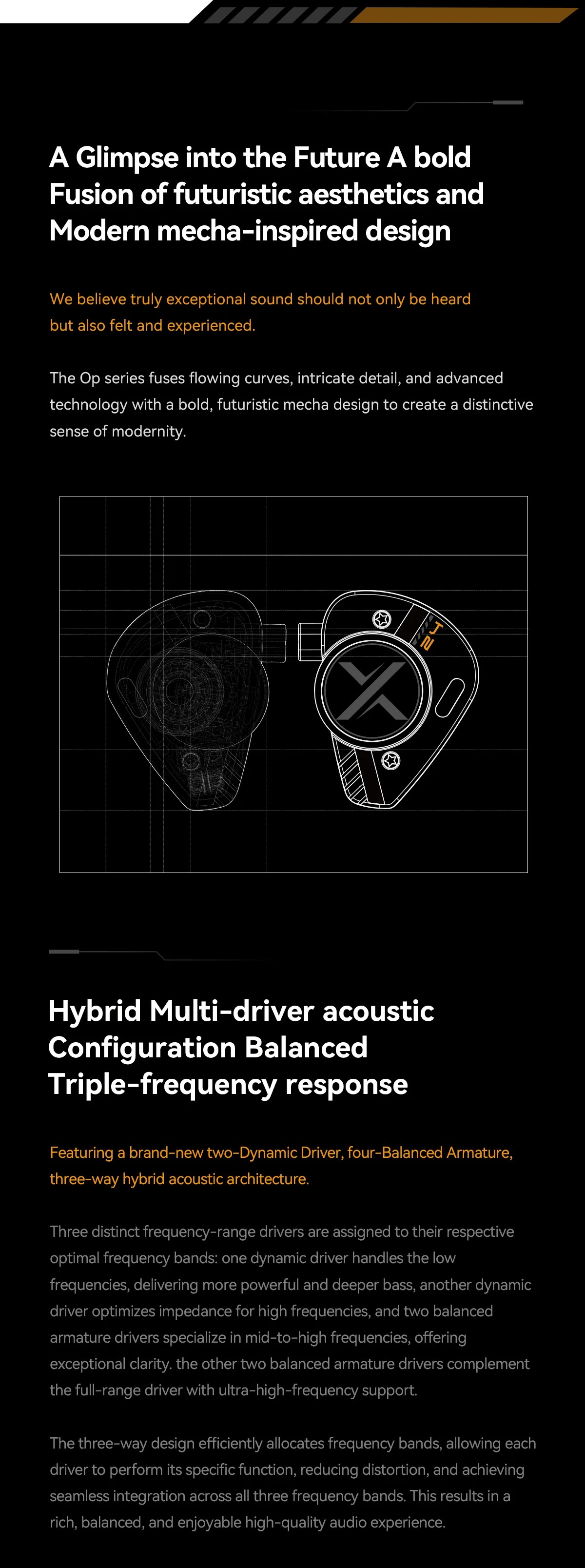 • FUTURISTIC AESTHETIC, MODERN PERFORMANCE – The OP.24 combines mechanical design with sleek, flowing curves for a look as advanced as its sound. It’s not just earphones—it’s a statement of modern audio engineering.