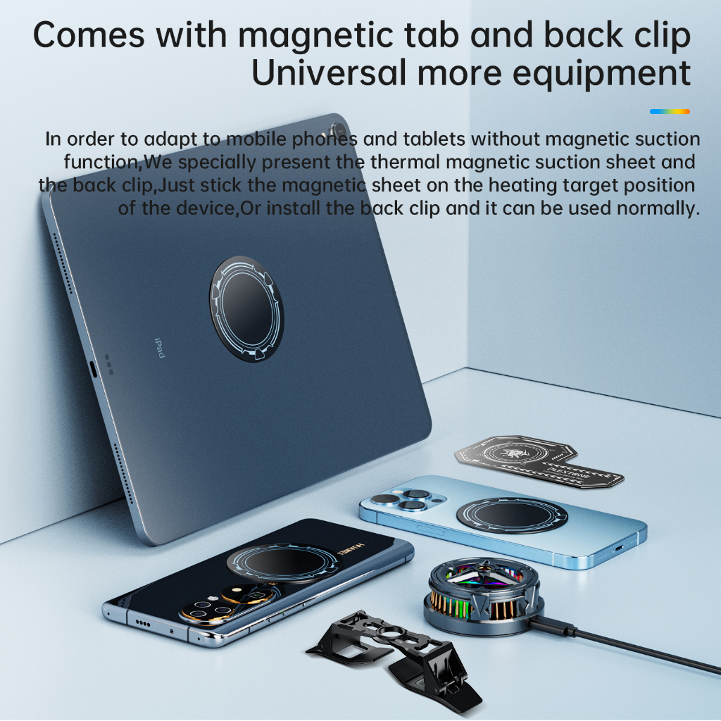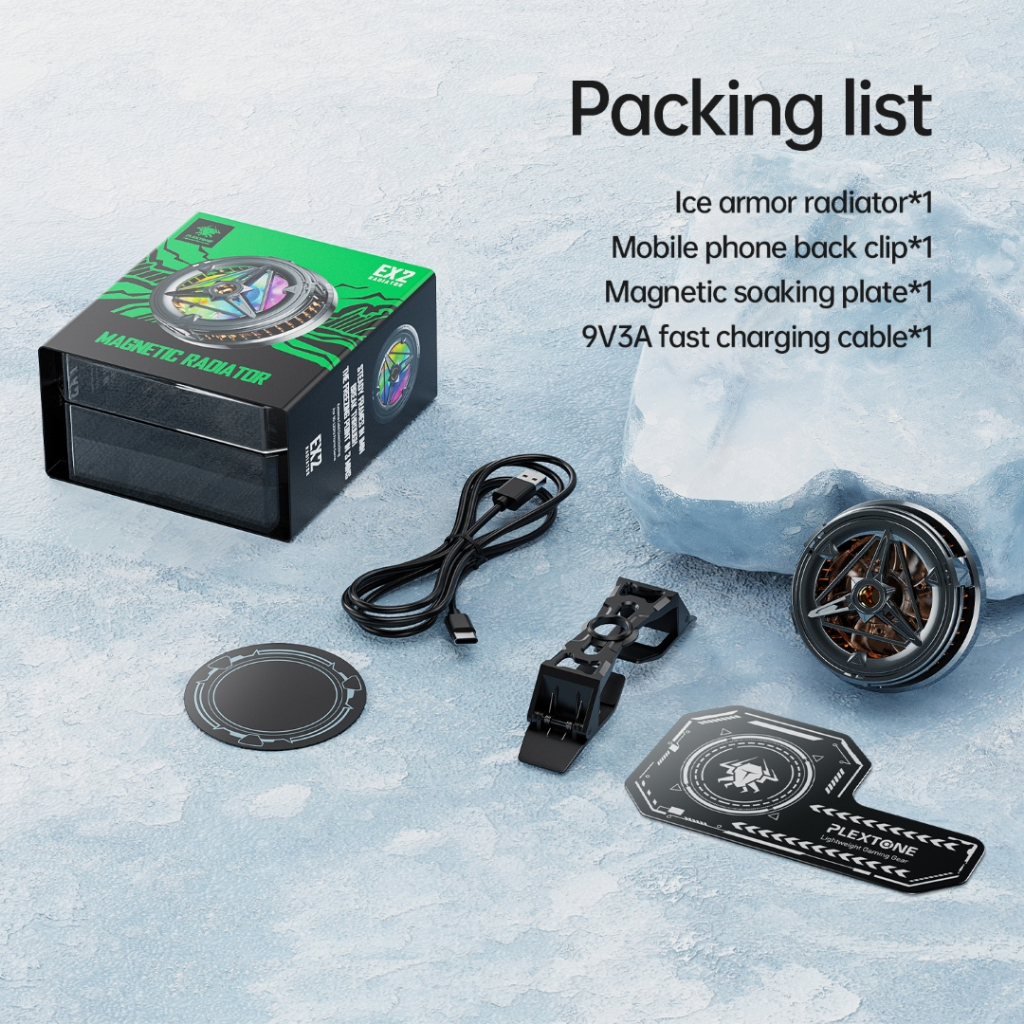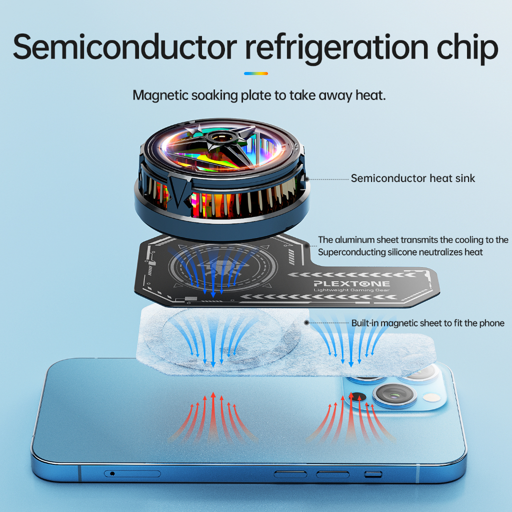 Get ready for a gaming revolution with the Plextone EX2 - the ultimate mobile phone gaming external cooling fan that keeps you in the game! Stay cool and level up your gaming with the copper plated heatsink, delivering top-notch thermal reduction. Experience low-noise operation and non-stop gaming with the optimized design. Say goodbye to overheating with the magnetic plate providing precision heat dissipation with magsafe positioning. Game with ease and style, as the ring design won't get in your way. The RGB lighting adds a dazzling touch to your gaming setup. With a phone clip and magnetic sheet for universal compatibility, the Plextone EX2 is a game-changer for every gamer!