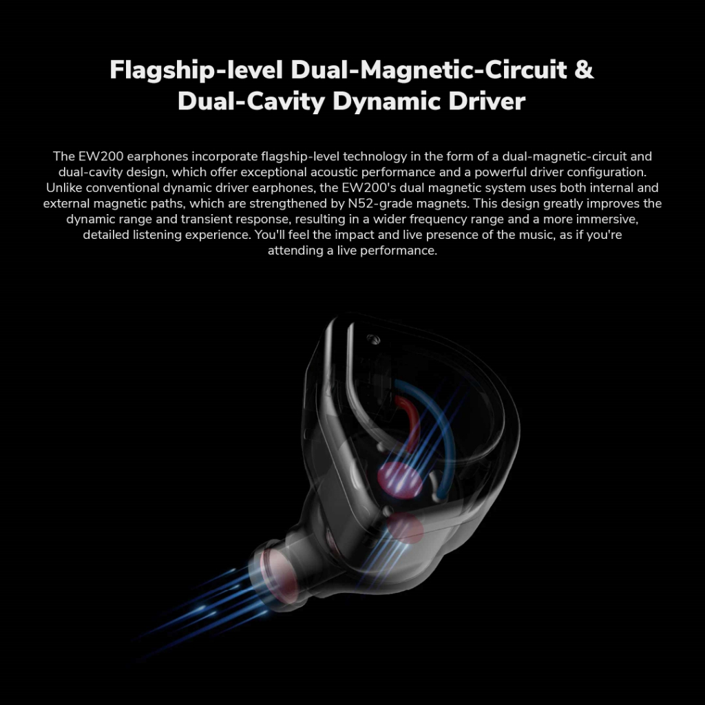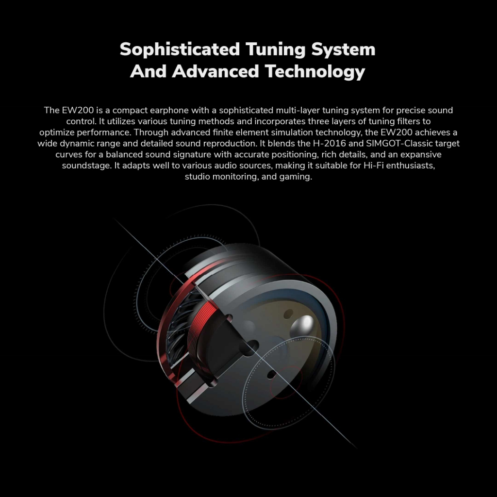 The EW200 features a multi-layer tuning system for precise sound control, blending various tuning methods and three layers of filters. With advanced finite element simulation technology, it achieves a balanced sound signature with accurate positioning and an expansive soundstage.