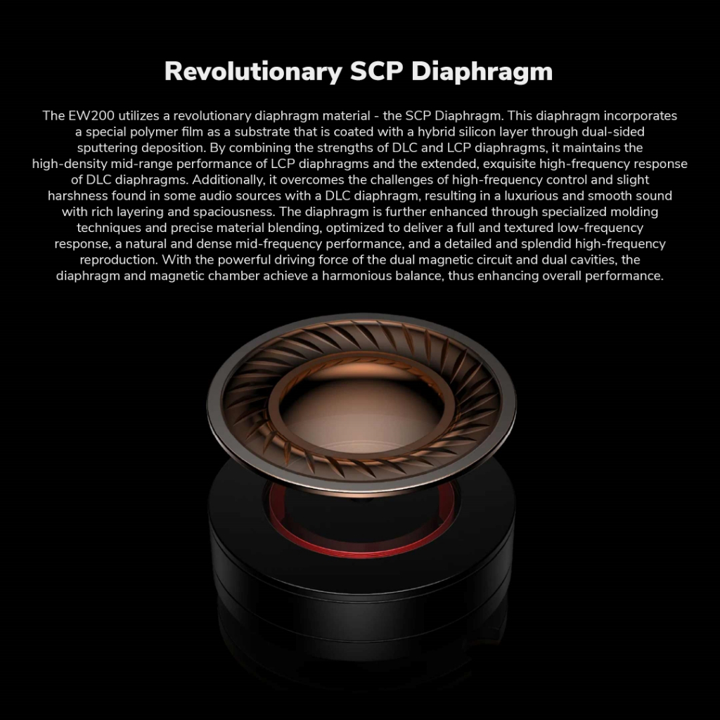 Revel in the luxurious sound of the EW200, boasting a revolutionary SCP Diaphragm for rich layering and spaciousness. Its hybrid silicon layer ensures a smooth and detailed sound that's both exquisite and spacious.