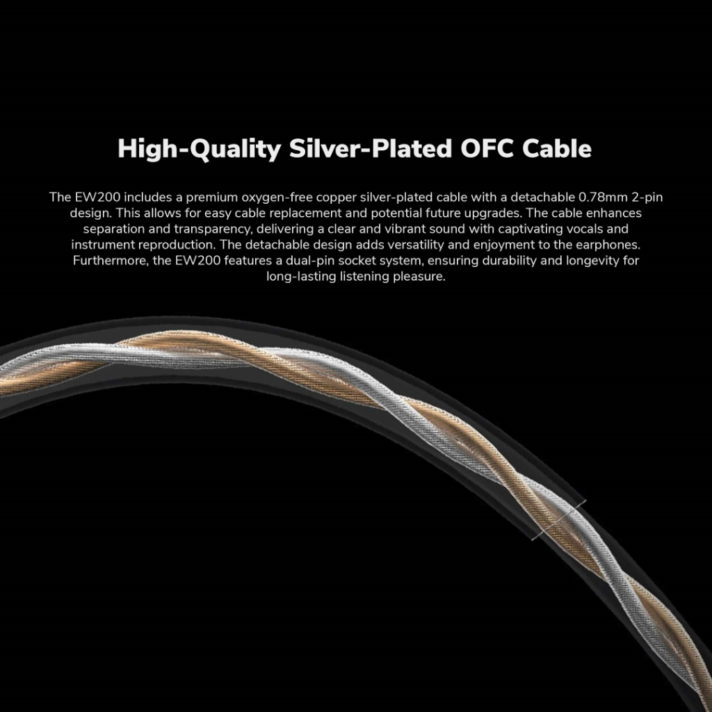 The EW200 includes a premium oxygen-free copper silver-plated cable with a detachable 0.78mm 2-pin design. This allows for easy cable replacement and potential future upgrades. The cable enhances separation and transparency, delivering a clear and vibrant sound with captivating vocals and instrument reproduction. The detachable design adds versatility and enjoyment to the earphones. Furthermore, the EW200 features a dual-pin socket system, ensuring durability and longevity for long-lasting listening pleasure.