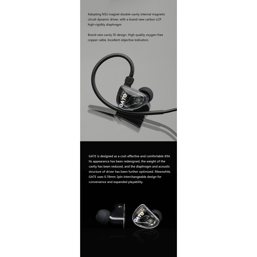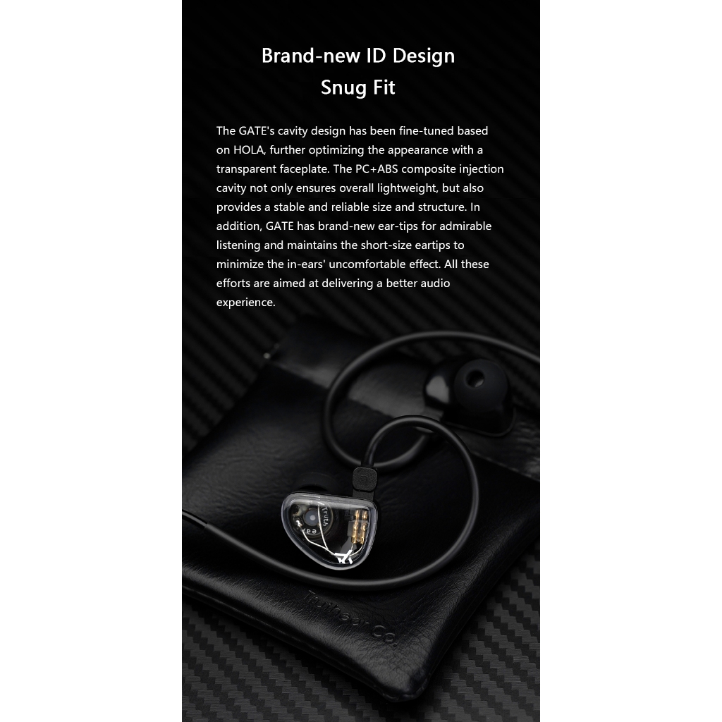 The Gate's redesigned lightweight cavity and transparent faceplate offer a comfortable and stable fit. The PC+ABS composite injection cavity minimizes discomfort during long listening sessions.
