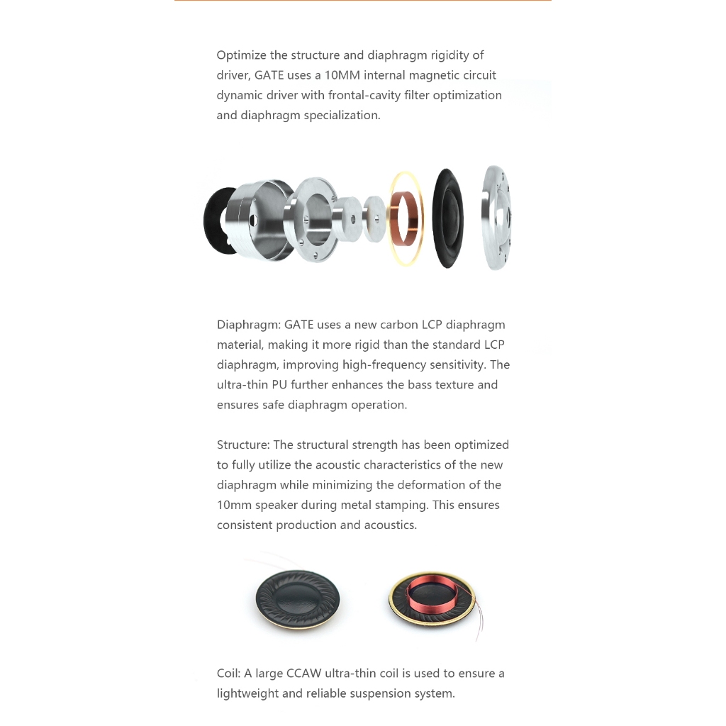 Utilizing a high-rigidity carbon LCP diaphragm, the Gate enhances high-frequency sensitivity and bass texture. The ultra-thin PU layer ensures safe diaphragm operation and rich audio details.